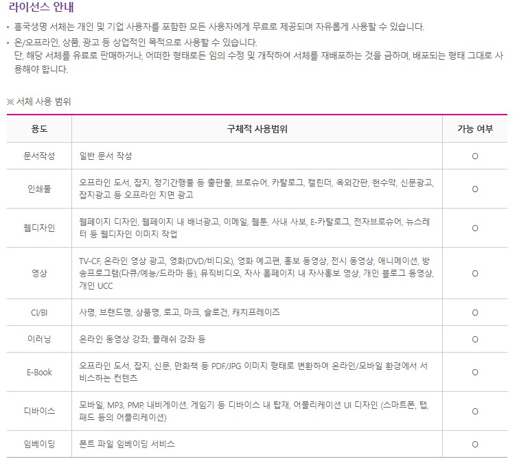 흥국생명 서체는 개인 및 기업 사용자를 포함한 모든 사용자에게 무료로 제공되며 자유롭게 사용할 수 있습니다.
