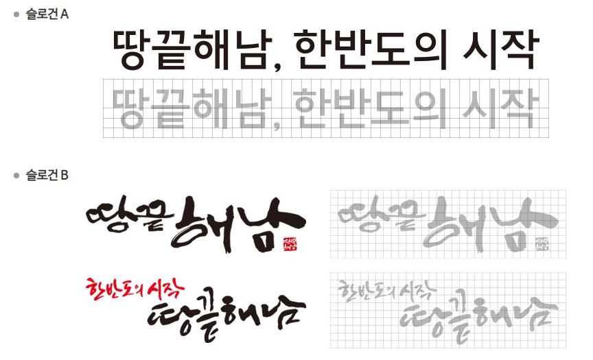 해남군의 비전과 특성을 나타내는 언어적 요소이다. 서체와 크기, 위치와 자간 등은 정해진 원칙을 잘 준수하여야 한다.